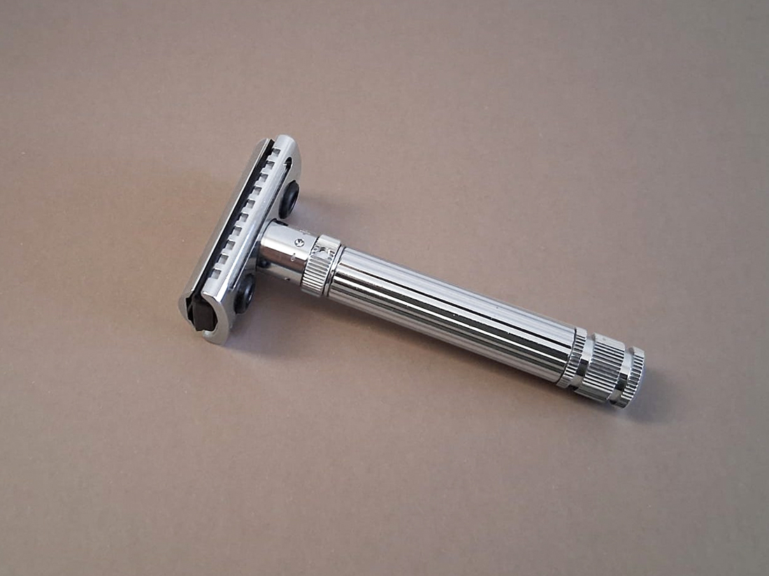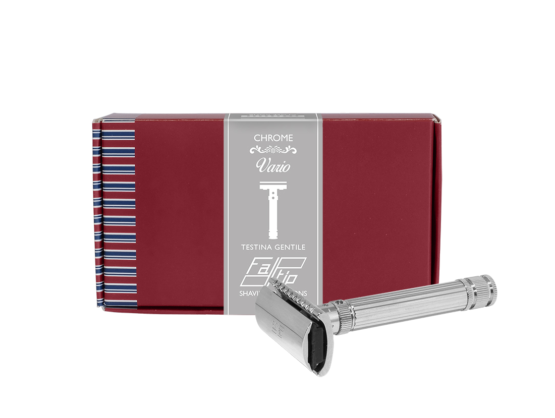 With the Fatip Vario adjustable safety razor, you can customize your shaving experience, adapting it to your skin, beard type, and personal preferences. The special adjustment feature allows you to change the aggression (the depth of the shave) using a rotating collar on the handle at the base of the head, by increasing or decreasing the space between the blade and the head’s comb (Blade Gap). The Vario is offered with the large classic handle.